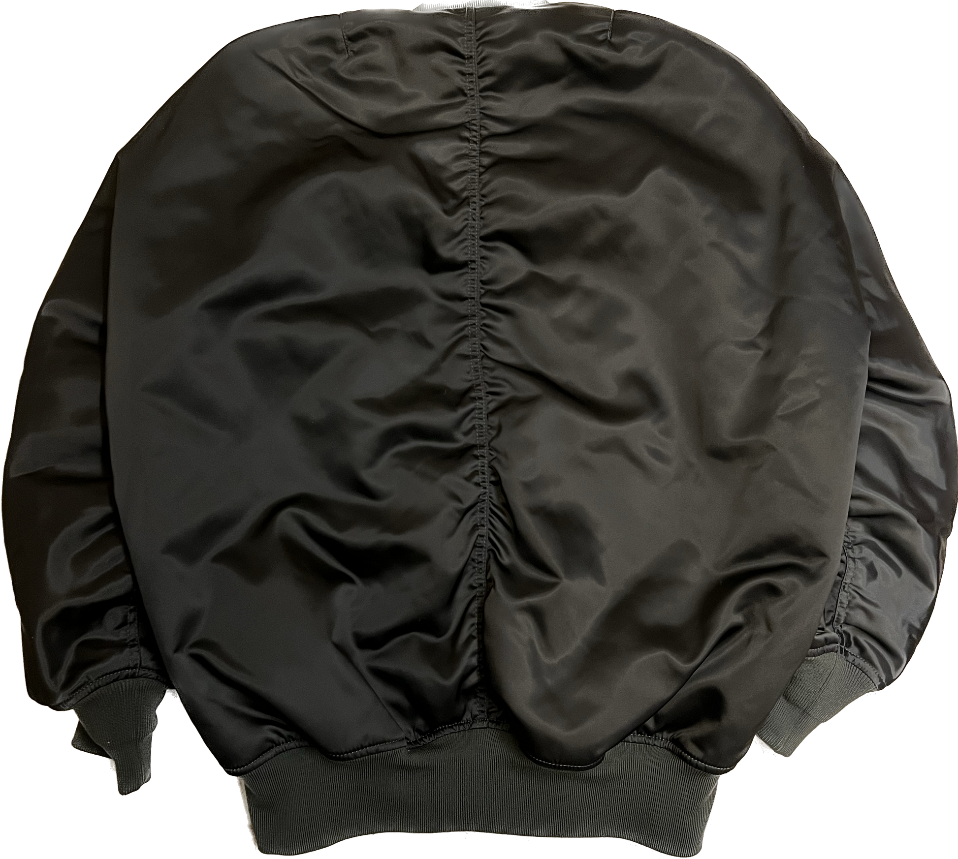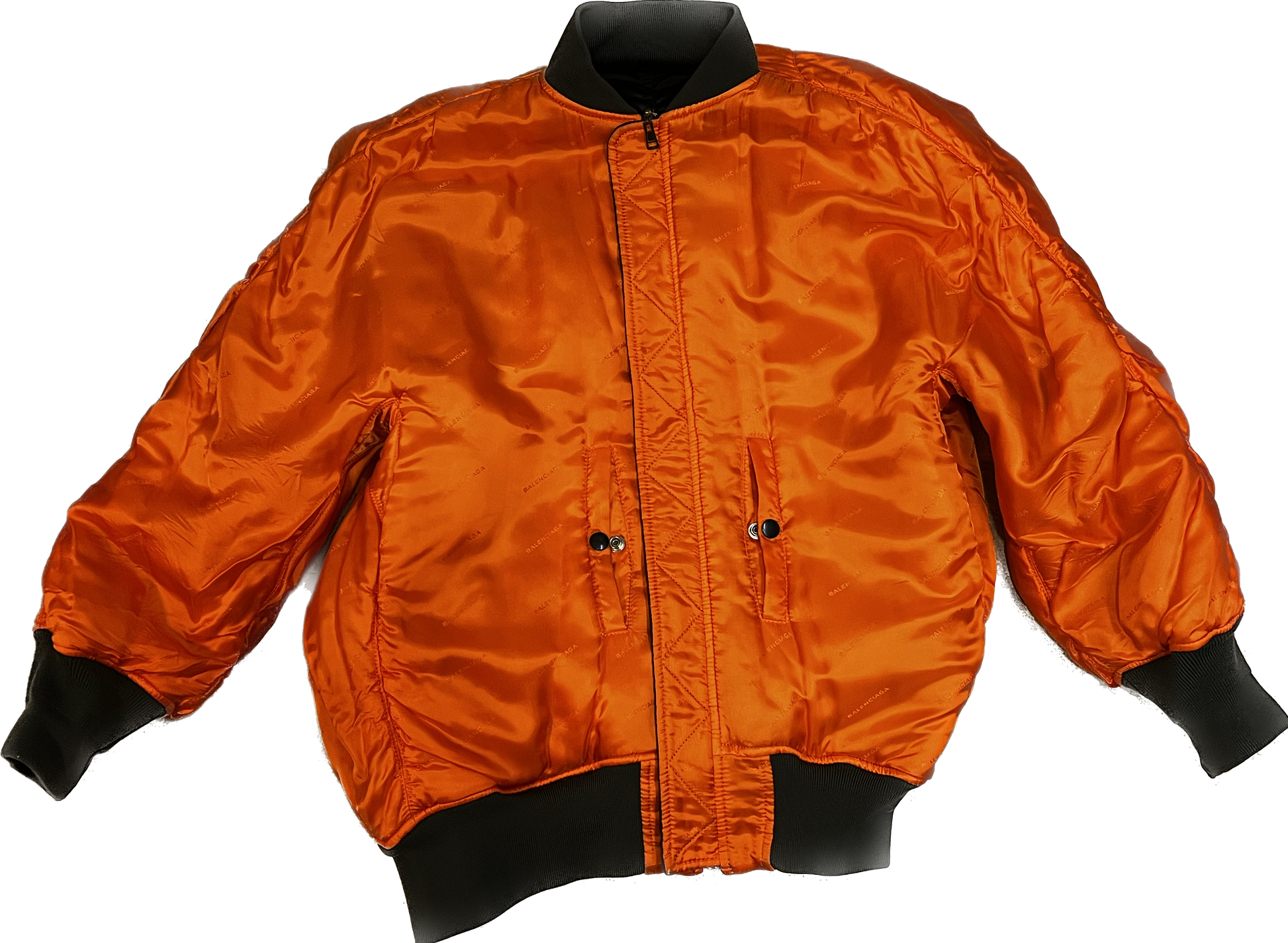 From Demna's early days at Balenciaga, released in 2017 this dark olive green bomber features an oversized silhouette, baseball style shawl collar, ruched sleeves, center back seam, and utility pocket on sleeve. The reverse side features an orange logo jacquard tech fabric. Labeled size 38 fits oversized
